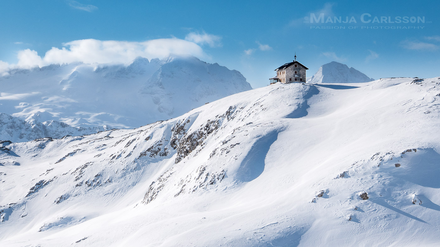 Diese kleine Hütte – oberhalb vom Boé auf dem Vallon (2550m) – liegt so ganz einsam und verlassen am Rande einer Bergkuppe. Zusammen mit der Marmolata (3343m), dem höchsten Berg in den Dolomiten im Hintergrund kommt diese „Zurückgezogenheit“ so schön zur Geltung. Auch die geschwungene Linienform der Bergkuppe nach links unten auslaufend finde ich toll. Besonders der kantige Bergzipfel rechts vom Haus im Hintergrund gibt diese Weite und Stille wieder.