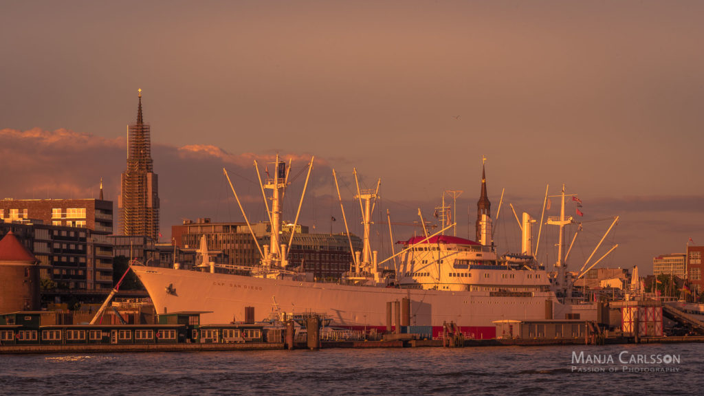 An den letzten Abenden war er so prächtig gewesen, so dass ich mir ein schönes Panoramafoto von den Ladungsbrücken erhofft hatte. Auch war es meine Wunschvorstellung, die Elbphilharmonie in den schönsten Abendrotfarben sehen und festhalten zu können.