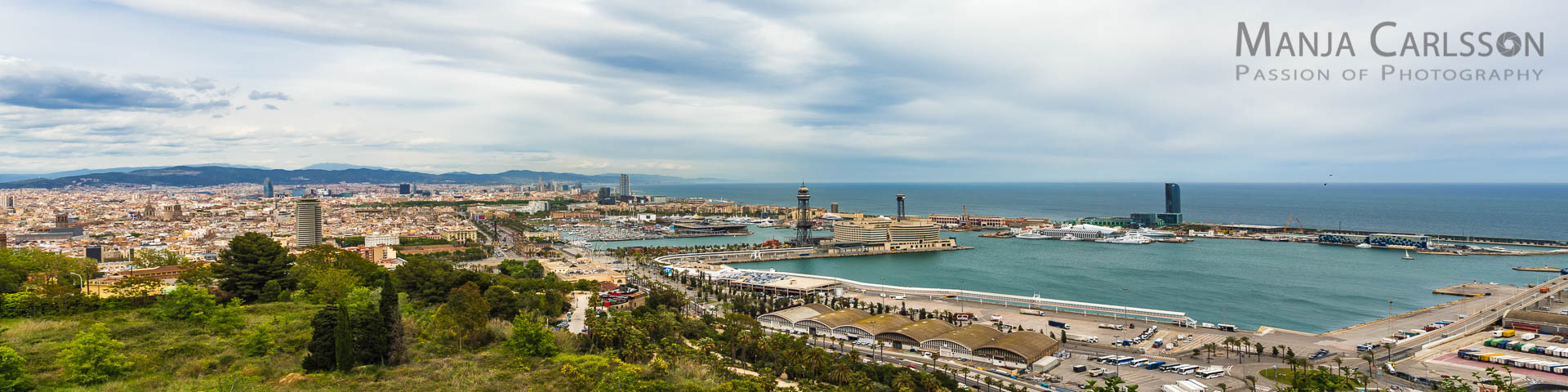 Das Wetter an diesem Tag war so trüb und diesig, dass jedes Fotografenherz echt enttäuscht sein musste. Wir versuchten unser Glück hoch oben auf dem Berg Montjuïc vom Jardines del Mirador del Alcalde. Zwischendurch wurde es mal etwas klarer, aber nicht wirklich. Die Aussicht ist gigantisch, denn hier oben wird einem erstmal das gesamte Ausmaß der Stadt Barcelona bewusst. Selbst mit einem Panoramafoto ist das nicht wirklich in die Kamera zu bekommen.