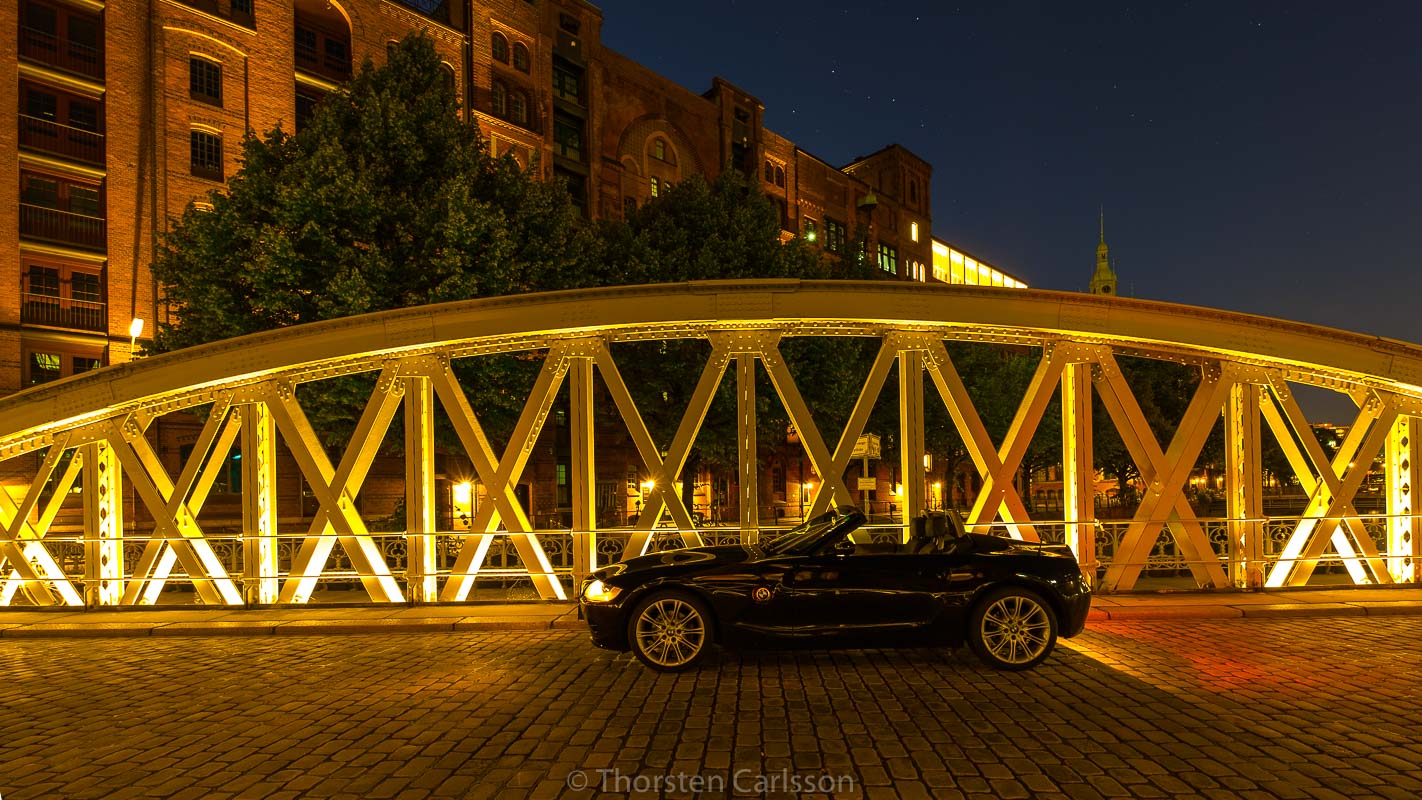 Gestern Abend war es aber endlich so weit. Endlich windstill und eine zauberhafte blaue Nacht brach gegen 23 Uhr in Hamburg ein. So fuhren wir fix in die Speicherstadt. Warum? Die Speicherstadt ist meine absolute Lieblings-Fotolocation in Hamburg. An der St. Annen-Brücke angekommen, musste ich gleich auf der Brücke mit dem recht neuen Super-Weitwinkel 14-24 noch mehr Weite (als letzen Sommer) einfangen. Erstaunlich was 14mm im Vergleich zu 24mm im Vollformat so ausmachen. Ich war total begeistert.