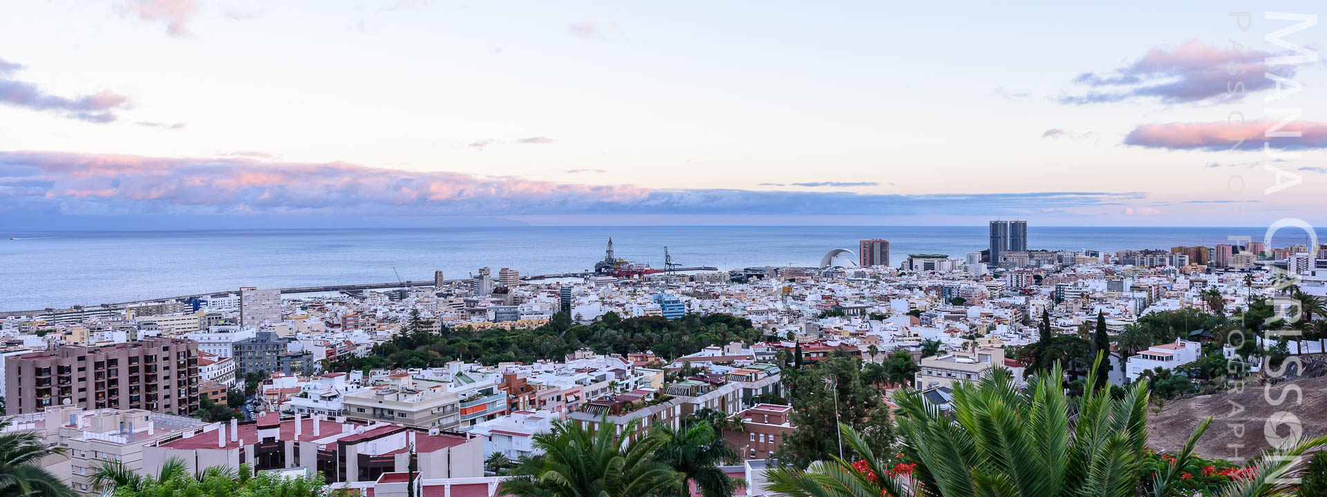 Hier in der C/ Cabo Álvaro Ojado Barrera hatten wir unseren ersten Blick auf die Dächer von Santa Cruz erhaschen können. Der Blick von hier war nicht schlecht, aber auch noch nicht so der Hit. Dieses Foto konnte ich noch aus der Hand knipsen. Es war jetzt 20.55h und der Sonnenuntergang ist 21.07h. Aber in Santa Cruz ist der Sonnenuntergang recht unspektakulär, da die Stadt im Südosten liegt und das Anaga-Gebirge das schöne Abendlicht verdeckt. Nur ein paar Wölkchen am Himmel weisen auf den Sonnenuntergang hin.