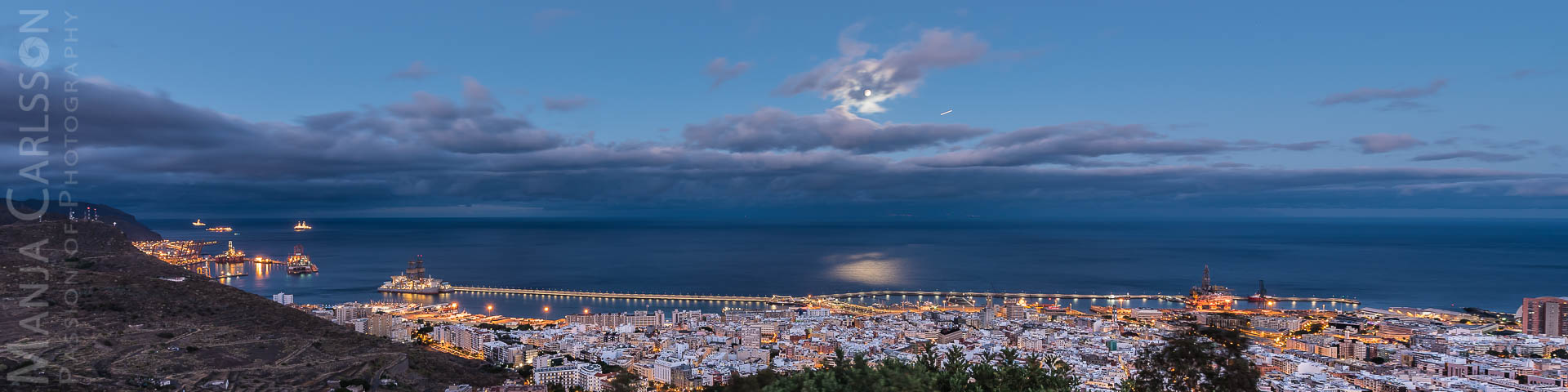 Jetzt war ein Fotografieren ohne Stativ nicht mehr denkbar. Es war jetzt 21.20h, die untergegangene Sonne färbte den Himmel in all seinen wechselnden Farben von orange über rosa,lila, violett und blau – alles war dabei gewesen. Die Mondaufgangszeit war eigentlich schon 20.36h, aber erst jetzt (45 Minuten später) lugte der Vollmond hinter der dicken Wolkenwand über Gran Canaria hervor.