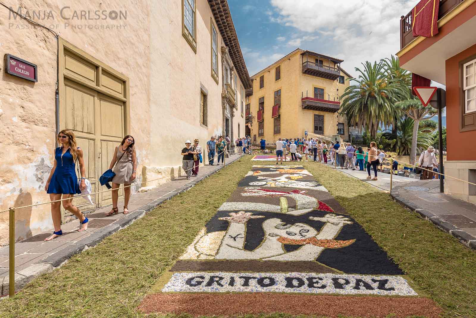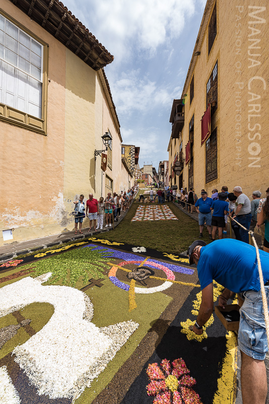 Jedes Jahr ist es immer wieder eines der schönsten Attraktionen für mich hier auf Teneriffa. Im Laufe des Tages kann man diese Blumenteppiche mit seinen vielen Motiven anschauen und bestaunen. Manche sind religiös, andere sind einfach nur bunt oder auch gerne politisch thematisiert.