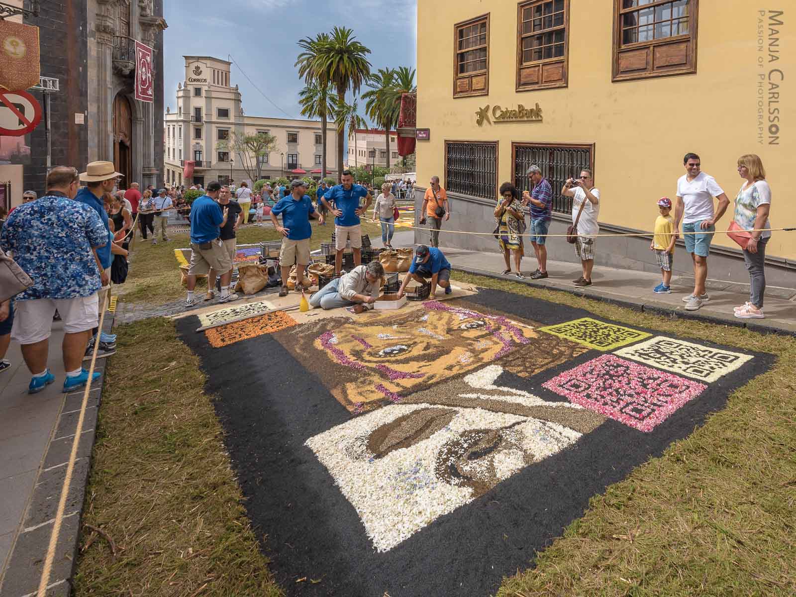 Jedes Jahr wird ein anderes kirchliches Motiv präsentiert. Wochenlang brauchen die Sandkünstler „Alfombristas“ um dieses Sandbild auf 900 Quadratmetern anzufertigen. Der Sandteppich wird aus verschiedenfarbigen Lavasand von Teneriffa gestaltet und dafür benötigen sie ca. zwei Tonnen Sand aus den Cañadas im Teide Nationalpark. Es soll das größte vergängliche Sandbild der Welt sein.