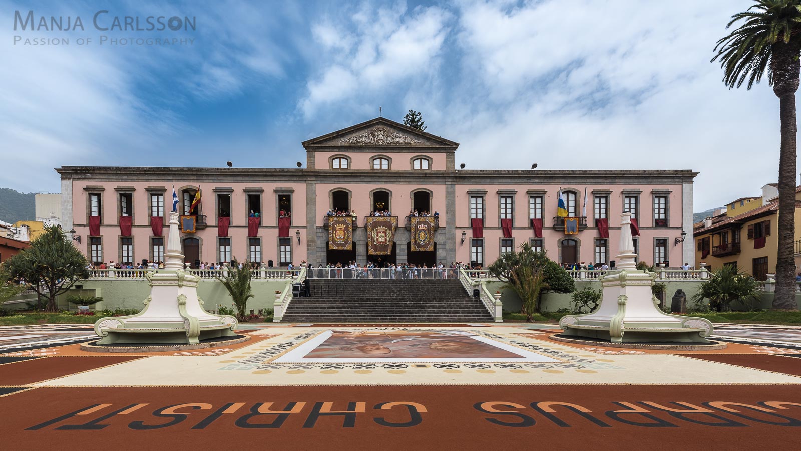 Der Blumenteppich führt direkt am Rathaus vorbei, wo der berühmte Sandteppich zu bestaunen ist. Das Rathaus (Ayuntamiento) öffnet dafür seine Türen, damit die Bevölkerung vom oberen Stock über die Balkone diesen Sandteppich bewundern und natürlich auch fotografieren kann. Dieses Jahr hatten wir das große Glück nicht lange anstehen zu müssen. Das sehr schwülwarme Calima-Wetter war wohl der Grund dafür.