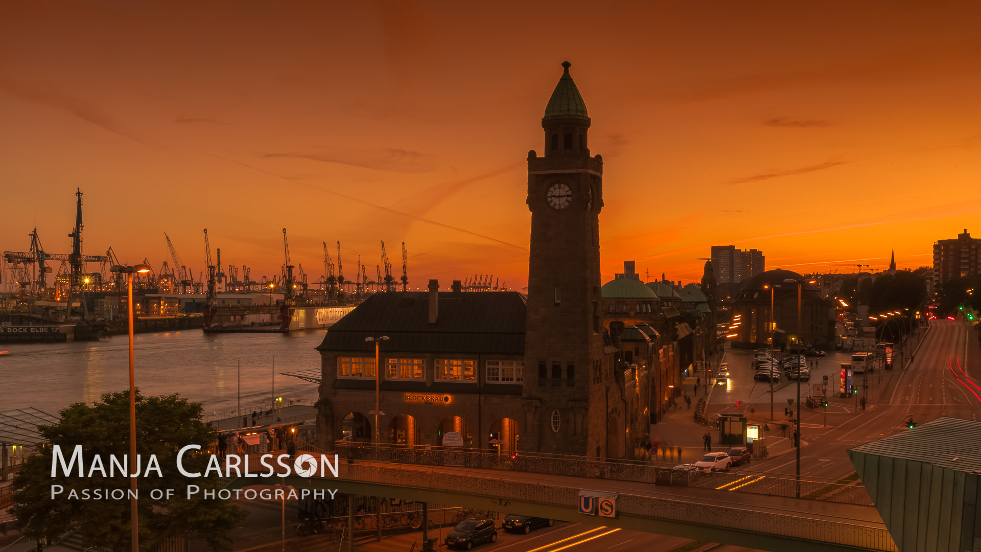 Blue Port Hamburg 2019 – Landungsbrücken – Lichtstreifen von Fähre und Blue Port Hafenkräne