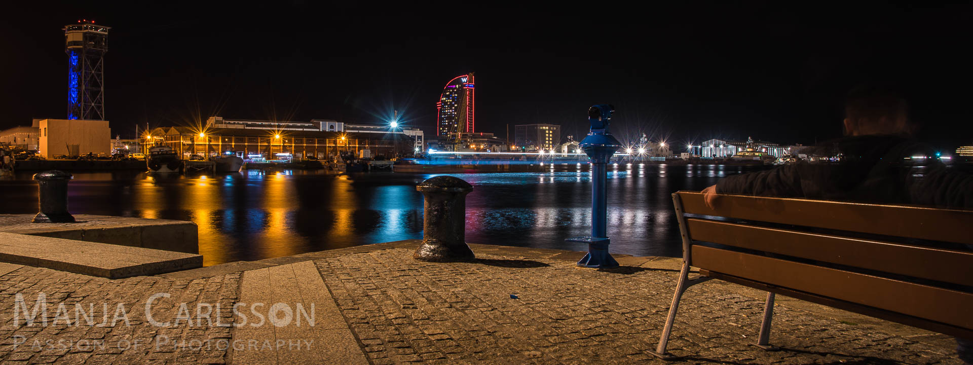 Nachts im Port Vell von Barcelona mit Blick auf den Handelshafen und dem W-Gebäude (f/16, ISO 100, 30 Sek, 24mm) – Kamera: NIKON D750, Objektiv: AF-S NIKKOR 24-120mm 1:4G ED VR