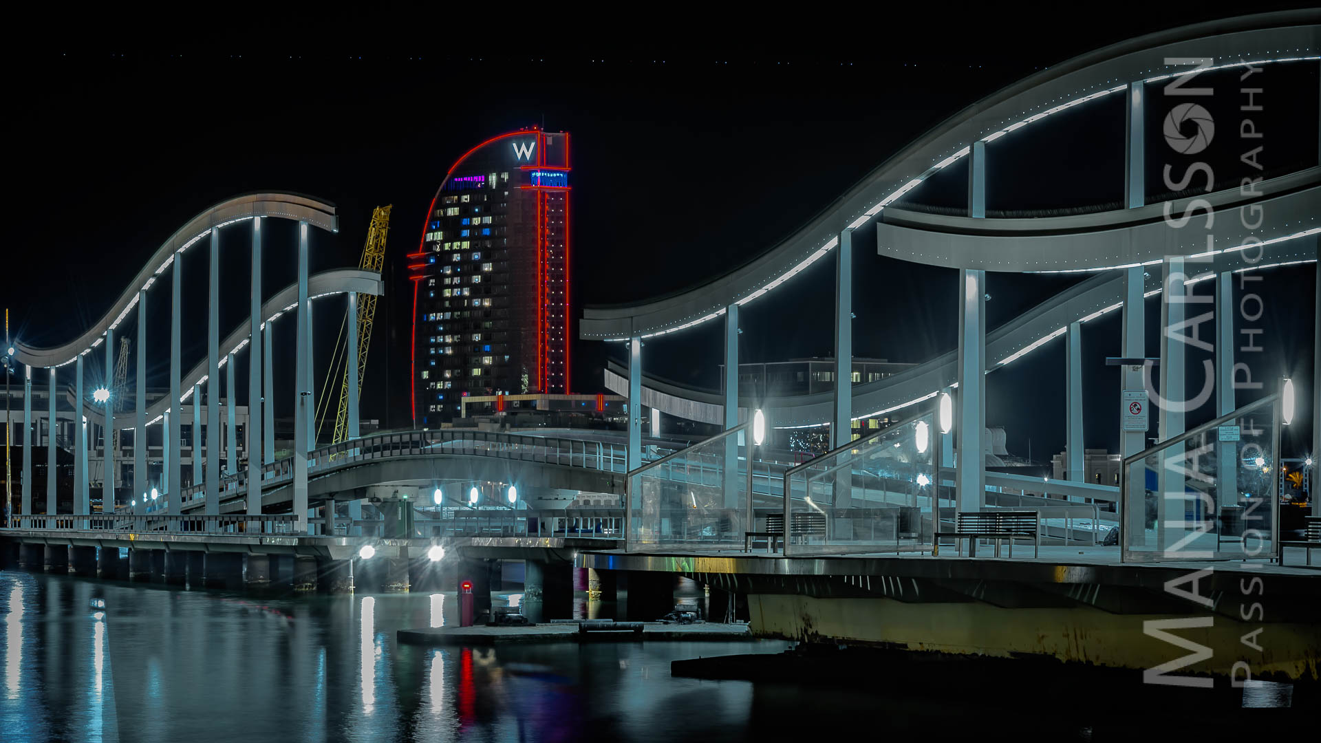 Rambla del Mar mit W-Gebäude in Barcelona – (f/16, ISO 80, 30 Sek, 92mm) – Kamera: NIKON D750, Objektiv: AF-S NIKKOR 24-120mm 1:4G ED VR