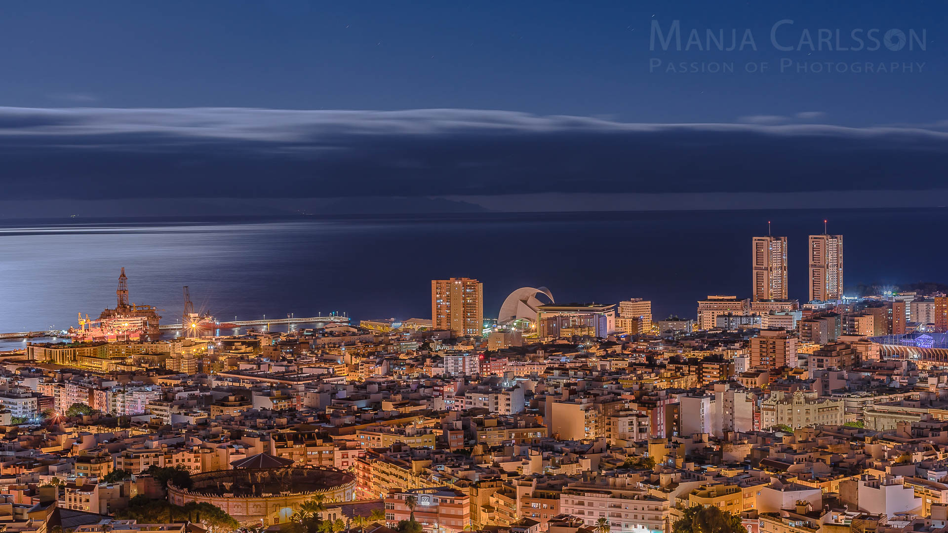 Blick auf Stadt und Hafen von Santa Cruz zur blauen Stunde bis nach Gran Canaria (f/8, ISO 100, 30 Sek, 24mm) – Kamera: NIKON D750, Objektiv: AF-S NIKKOR 24-120mm 1:4G ED VR