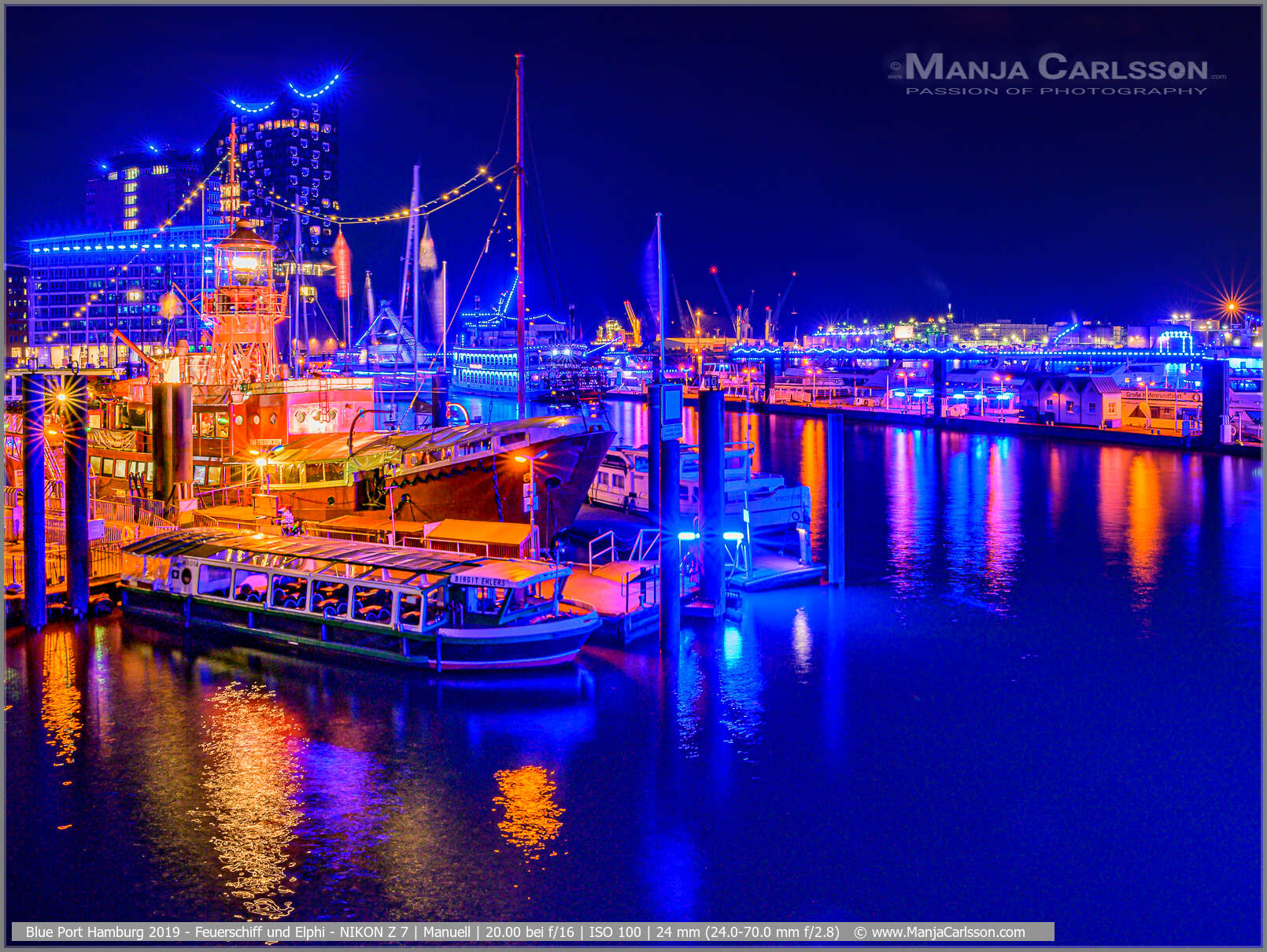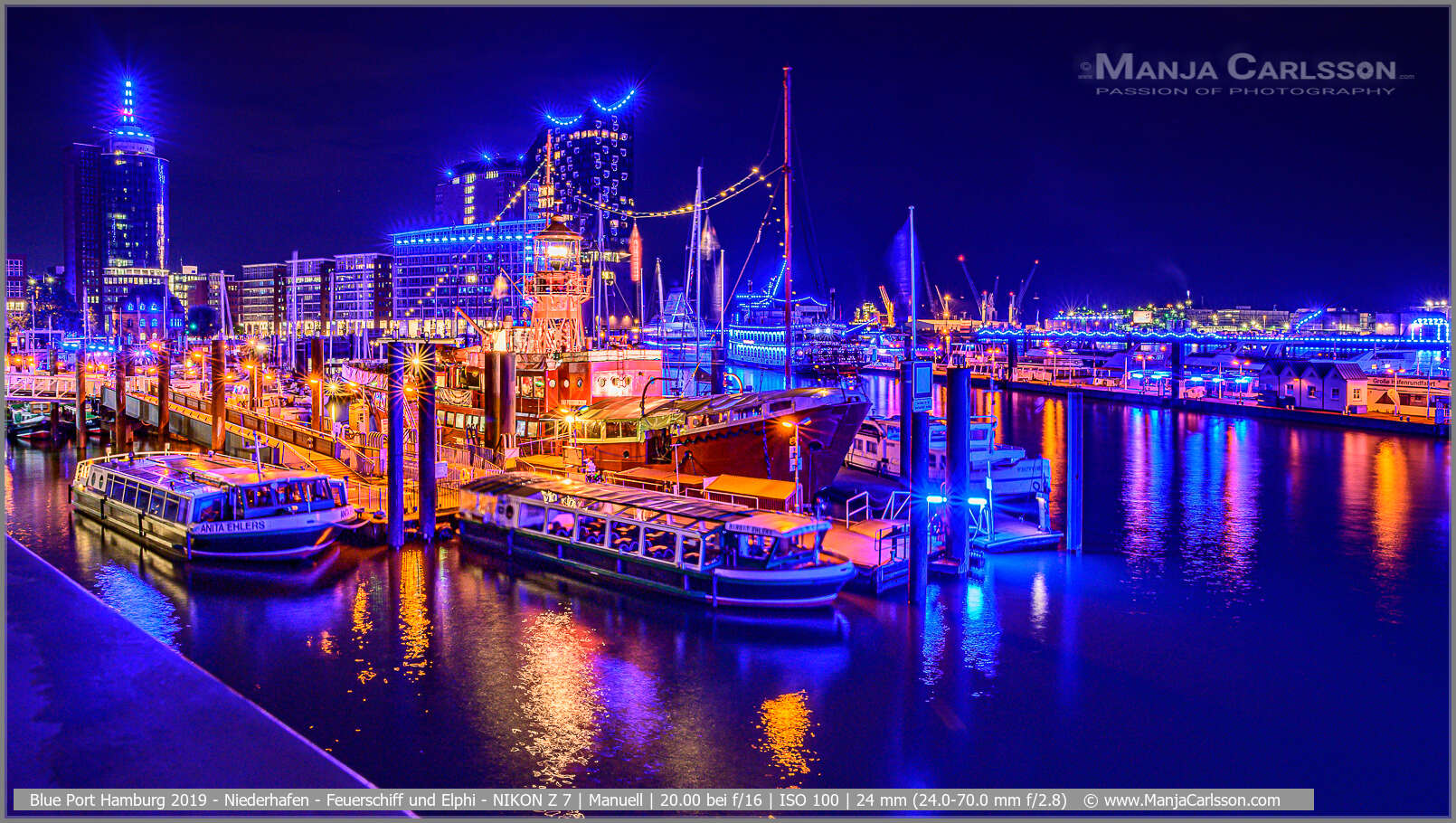 Blue Port 2017 – Fotospot Überseebrücke – Blick auf den Niederhafen mit Elbphilharmonie und Feuerschiff – f/16 | ISO 200 | 13 Sek | 24 mm – Kamera: NIKON D750 + Objektiv: AF-S NIKKOR 24-120mm 1:4G ED VR