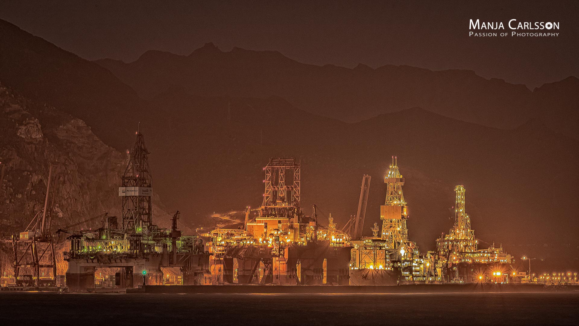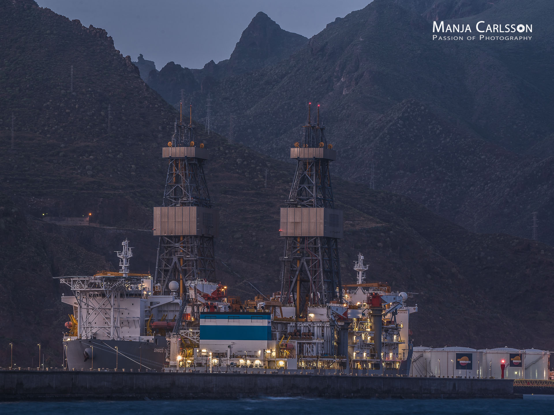 Oben angekommen, bemerkte ich sofort, dass der starke Wind noch weiter zugenommen hatte. Unglaublich, auf dem Land selbst ist kaum etwas davon zu spüren gewesen. Es ist so, als ob der Wind um die Ostspitze vom Norden her herum weht. Der Wind kam direkt von vorn. Ein Versteck als Windschutz ist hier oben – wie befürchtet- weit und breit nicht in Sicht. Die Lichter der alten Öl-Bohrinseln, sowie die der anderen Schiffe im Hafen und auf dem Meer waren bereits hell erleuchtet und die kurze blaue Stunde war auch schon voll im Gange. Das war imposant anzusehen. Der Wind dagegen war ganz großer Mist. Trotzdem ließ ich mich nicht davon abhalten und probierte es einfach aus.