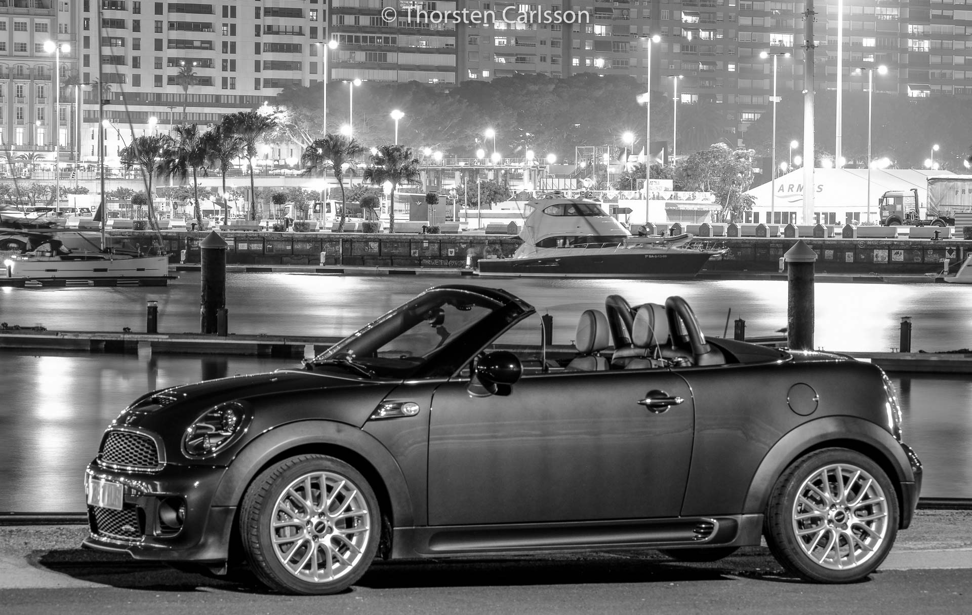 Und hier ist mein absolutes Lieblingsfoto von der ganzen Fotosession an diesem Abend. Deshalb musste es natürlich auch unbedingt mit rein. Das ist allerdings von Thorsten fotografiert worden. Ich liebe unseren kleinen süßen Flitzer. Mit diesem maritimen Hafenstadtflair im Hintergrund und der direkten Beleuchtung durch die Laternen hat Thorsten den Mini Roadster perfekt in Szene gesetzt. Das tollste Auto… – das sagten uns auch immer wieder die Canarios heute Abend beim Vorbeigehen.