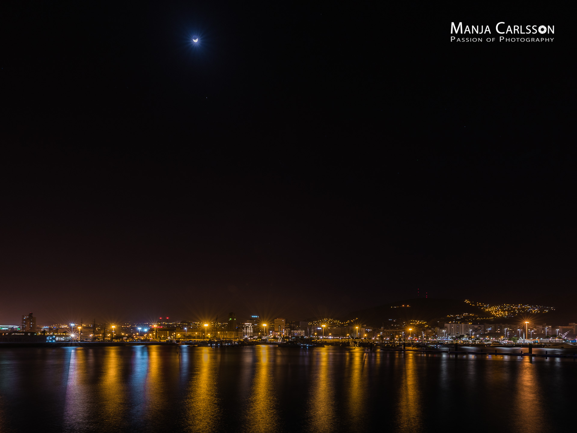 Dann befestigte ich die Kamera erneut auf dem Stativ und positionierte sie genau an diese ausgesuchte Stelle. Ich musste die Kamera recht weit nach oben schwenken, um auch noch den Mond zusammen mit den Reflexionen ablichten zu können. Was dann aber Dank Lightroom wieder in den korrekten Winkel zurecht gerückt werden konnte, denn stürzende Linien, wie kippende Häuser oder Laternenpfeiler gefallen mir so gar nicht. Ein absolutes NoGo…