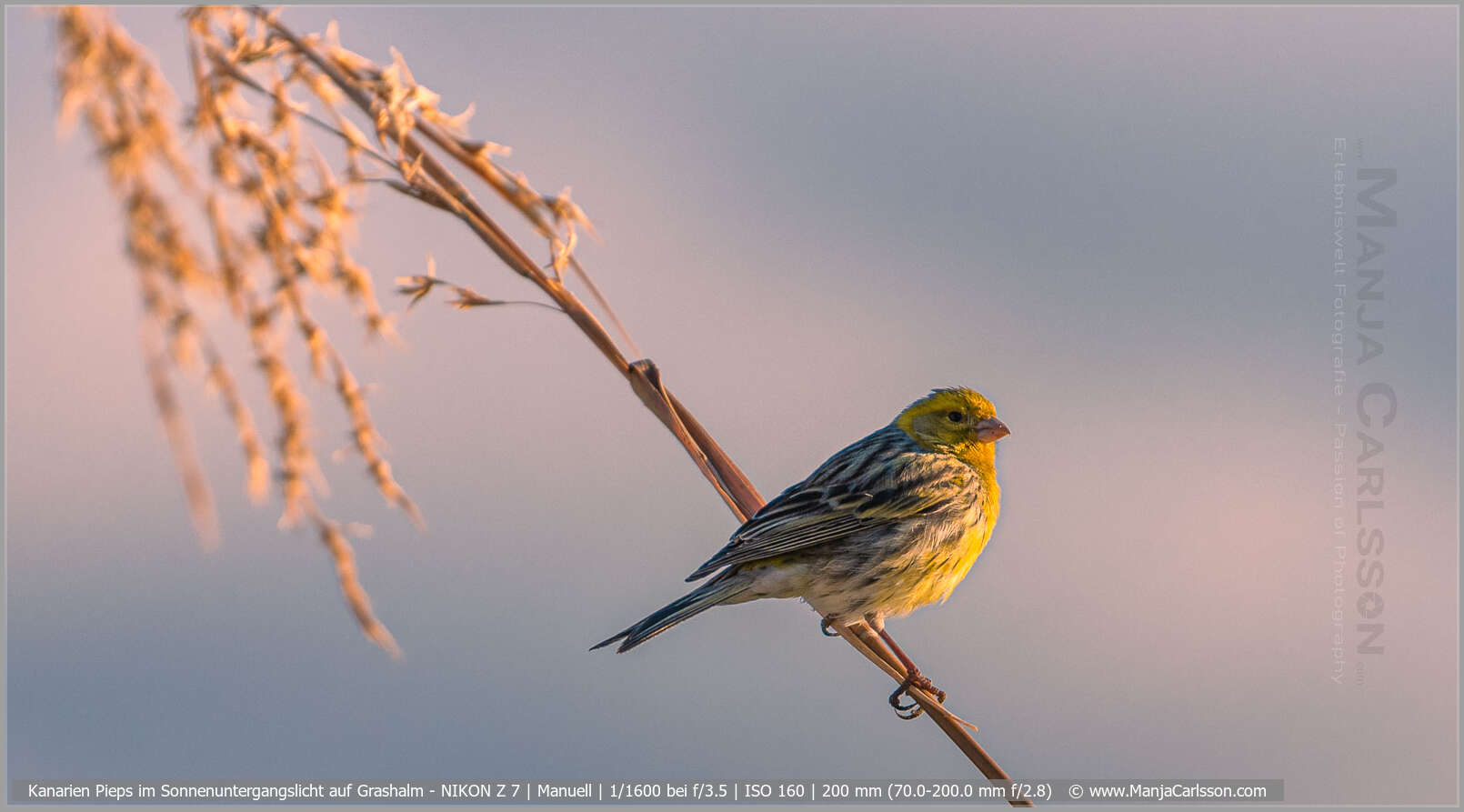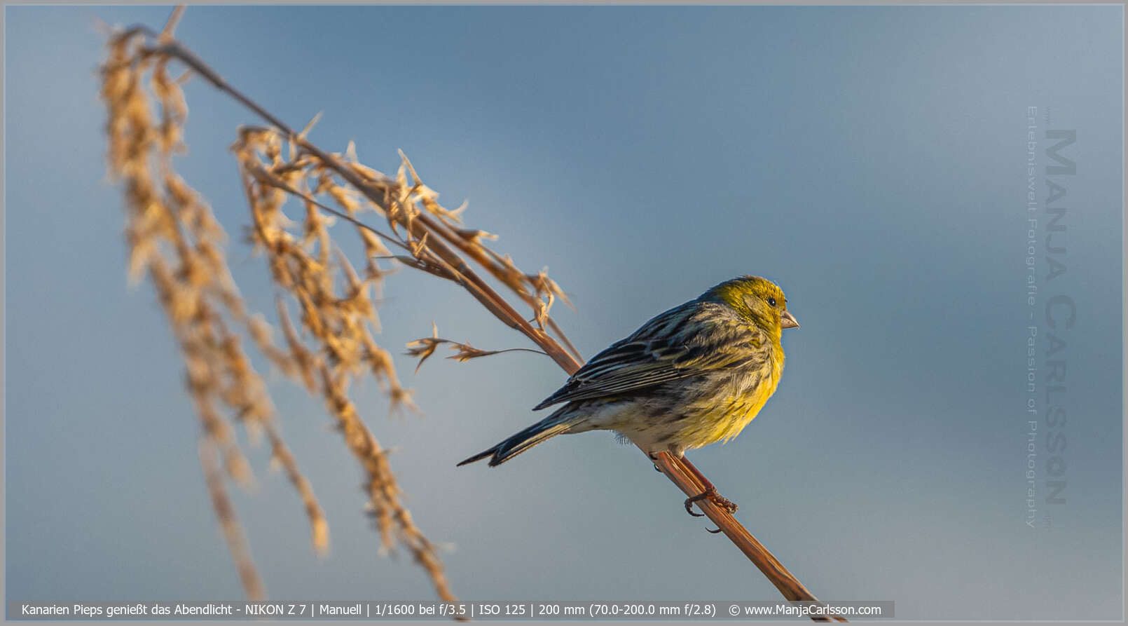 Ich war schon fast dabei die Nikon Z7 Kamera* hinterher zu schwenken, da kam der nächste Gast. Und dieser Kanarienvogel setzte sich perfekt positioniert ins restliche Abendlicht. Und auch von ihm wurde ich erstmal interessiert beobachtet.