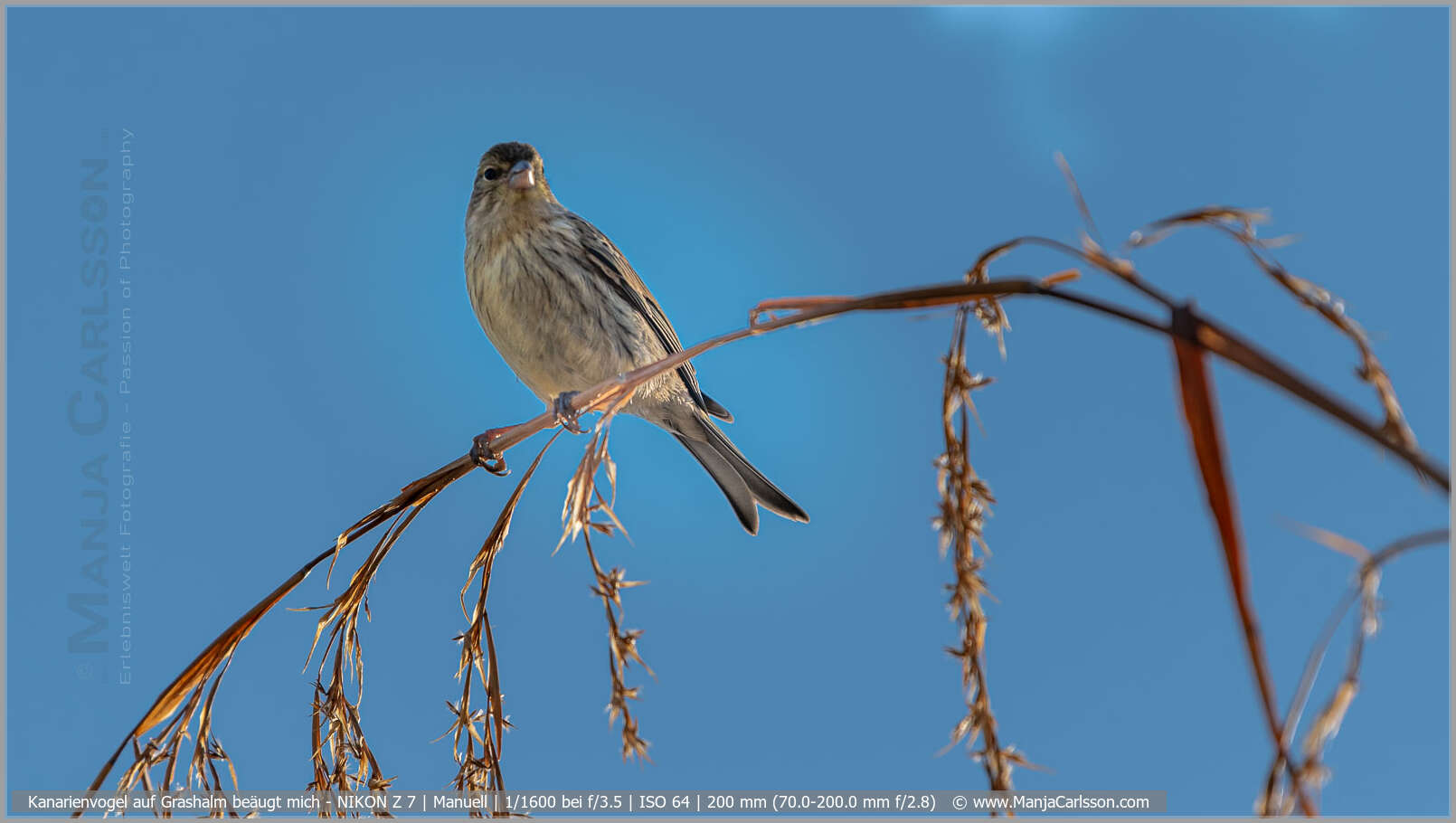 Und dann kam doch noch ein später Abendgast. Der Kanarienvogel flog auf den Grashalm und bemerkte mich erst dann. Mein Vorteil war, dass die Kanarienvögel unsere Anwesenheit schon gewohnt waren und somit nicht ganz so scheu sind. Deshalb blieb er auch sitzen und beäugte mich erst einmal. Ansonsten sitze ich ja auf dem Gartenstuhl etwas weiter weg.