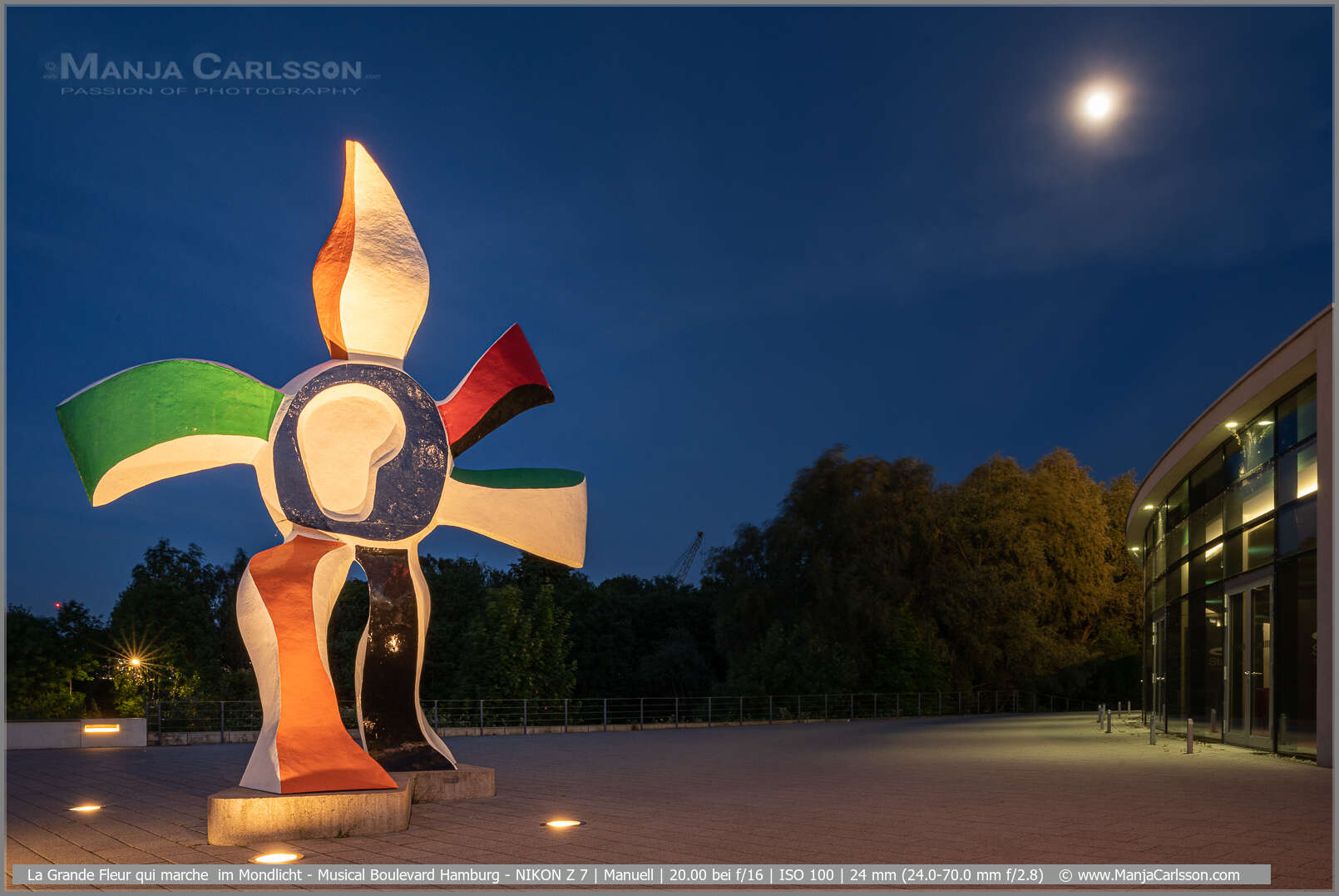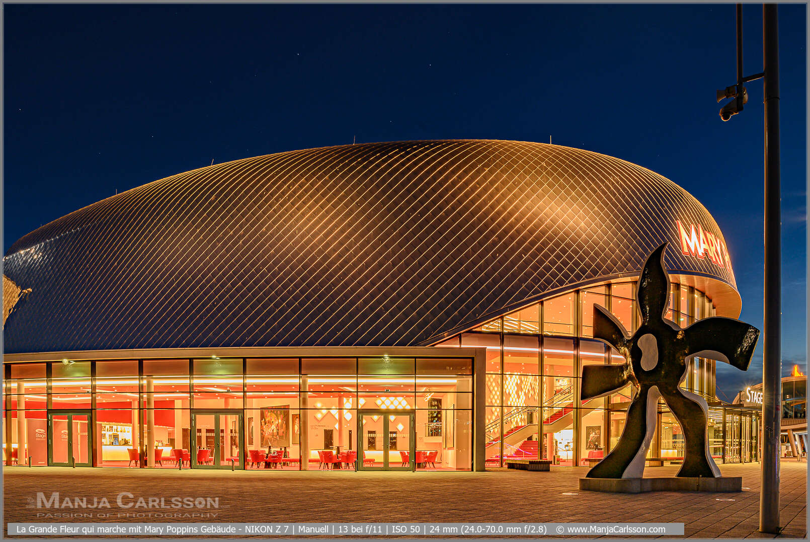 Den Ausblick auf die Skyline von Hamburg fotografiere ich immer wieder sehr gerne und die Kunst-Skulpturen am Musical-Boulevard machen diesen Ort zu etwas außergewöhnlichem. Dieses Foto mit der Kunst-Skulptur La Grande Fleur qui marche und dem Mary Poppins Gebäude ist genau vor einem Jahr ebenfalls im Juni entstanden. Da war sternenklare Nacht. Ich fand die Einrichtung vom Mary Poppins Musical zusammen mit der laufenden Kunstskulptur „La Grande Fleur qui marche“ einladend (bis auf diesen blöden störenden Laternenpfeiler).