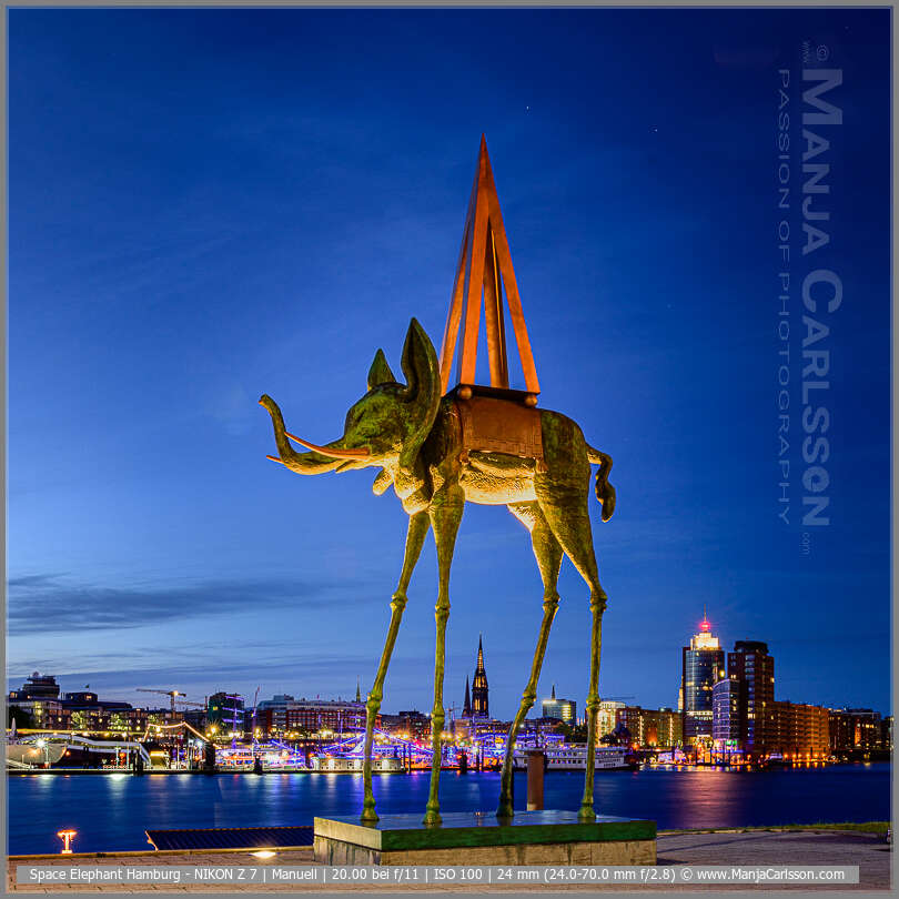 Durch seine Höhe wusste ich erst gar nicht, wie ich den Elefanten am besten ablichte. Ich wollte keine stürzenden Linien auf dem Foto haben und dazu eine ansprechende Perspektive mit der Skyline von Hamburg haben.