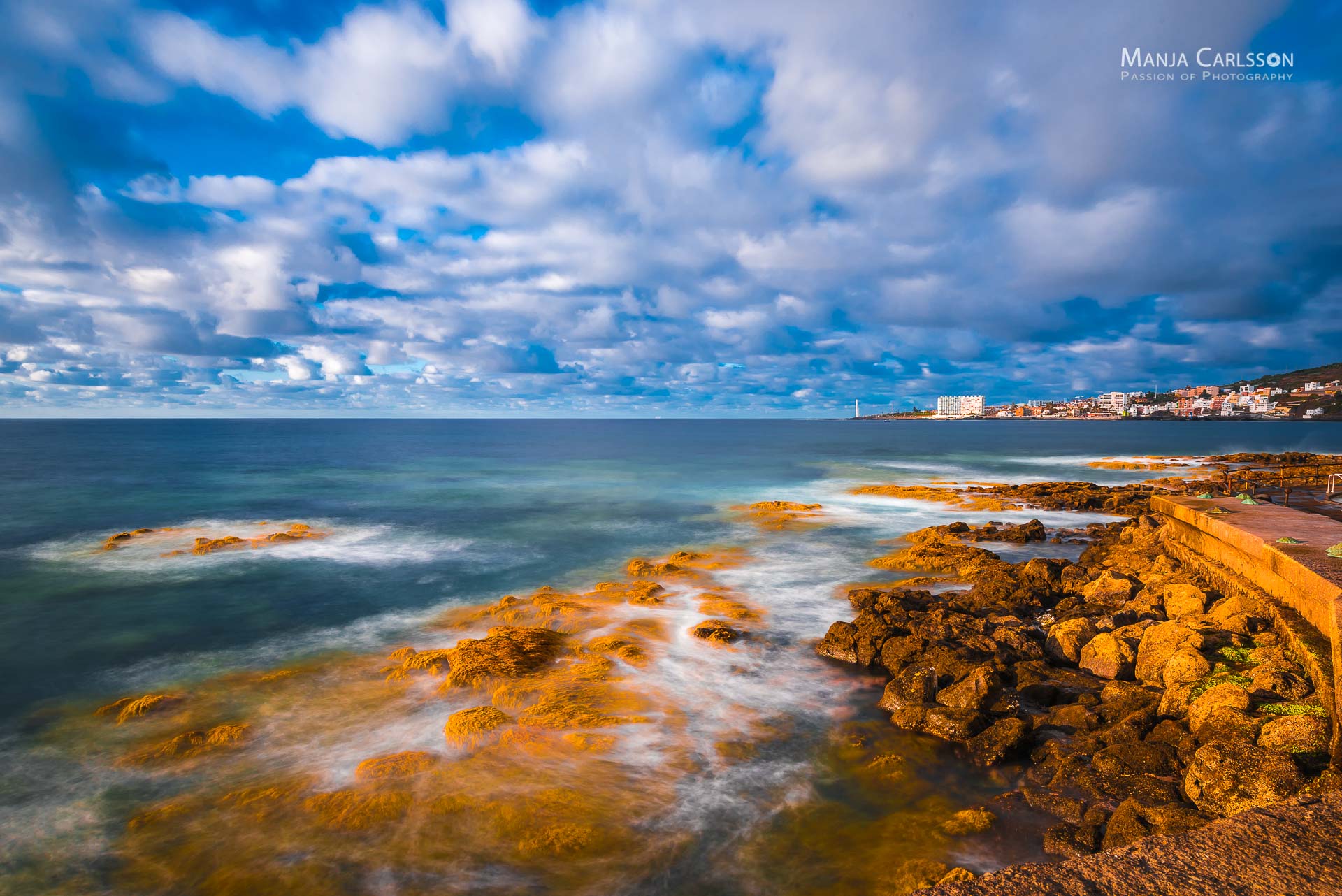 Was mich hier so an der Filterfotografie begeisterte, war nicht nur das warme, abendliche Sonnenlicht, sondern auch die eingefangene Dynamik der Wolken und die Verwischung der Wellen. Da für mich beides die gleiche Wertigkeit hat, habe ich auch den goldenen Schnitt mit Absicht mal außer Acht gelassen und den Horizont einfach in die Mitte gesetzt.