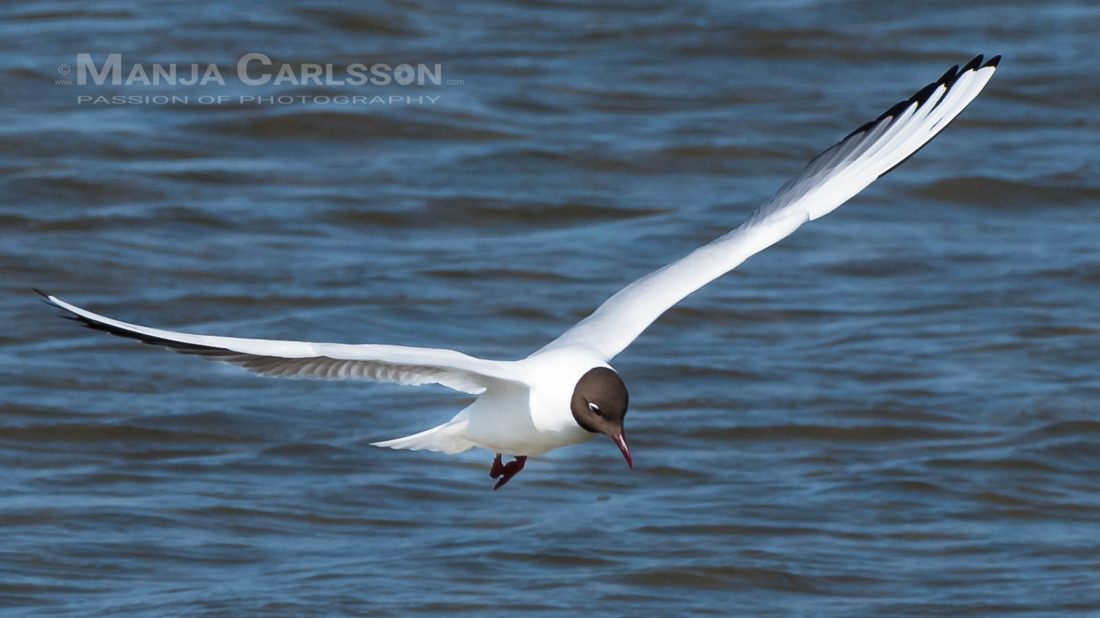 Lachmöwe mit ausgebreiteten Flügeln auf Fischsuche – f/11 | ISO 500 | 1/1250 Sek | -⅓ LW | 500mm – Kamera: NIKON D750 + Objektiv: AF-S NIKKOR 200–500 mm 1:5,6E ED VR © www.ManjaCarlsson.com – All rights reserved.