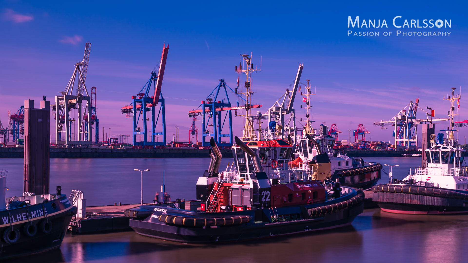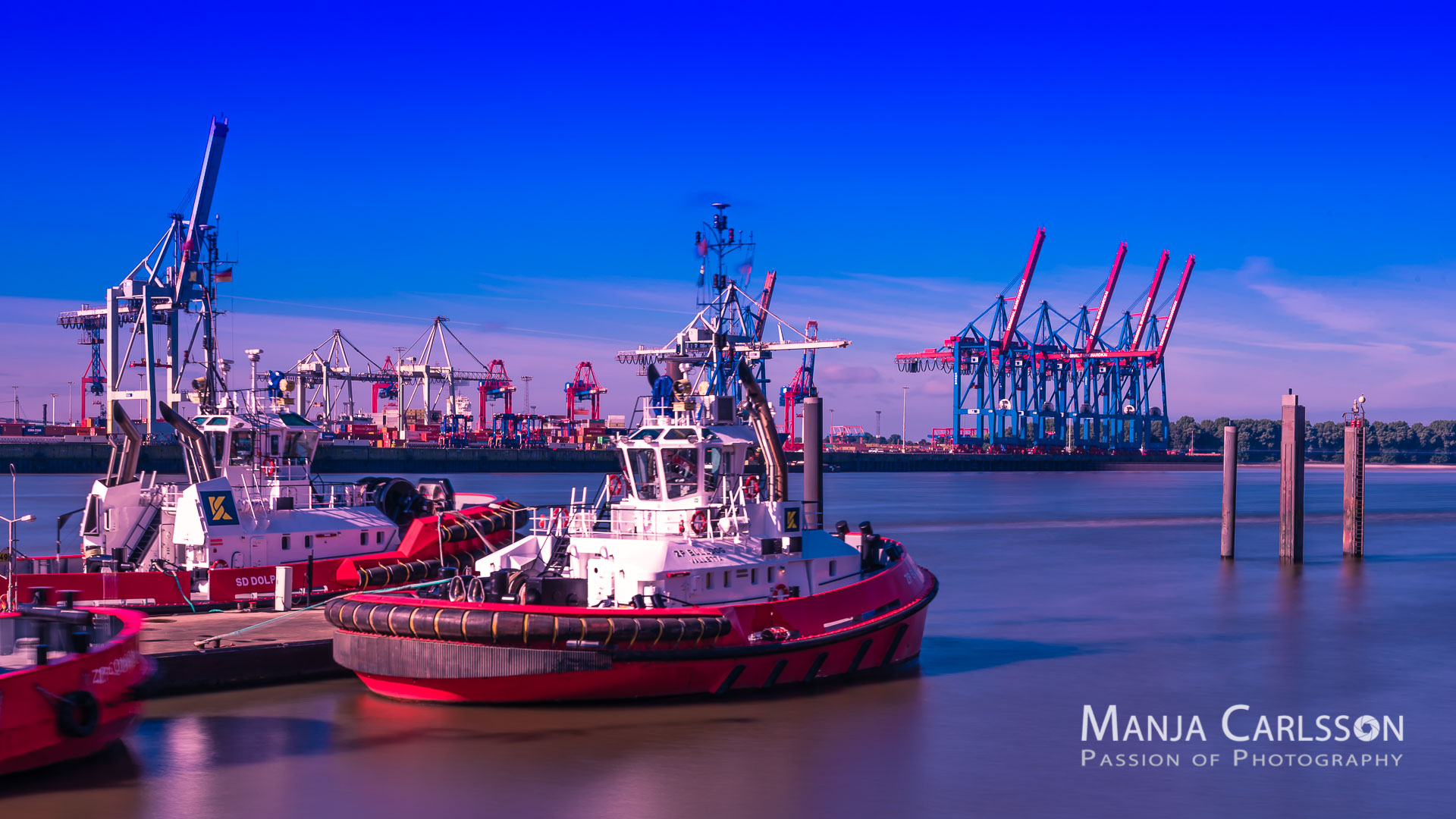 Die Schlepper bewegten sich leicht auf der Elbe. Dadurch ergab sich eine kleine Unschärfe, was mir zum Anfang missfiel. Bei näherer Betrachtung empfand ich dann aber, dass diese Unschärfe eine gewisse Dynamik ergibt. Der Rest blieb ja scharf. Auch die Schärfentiefe kommt durch die Langzeitbelichtung sehr gut zur Geltung.