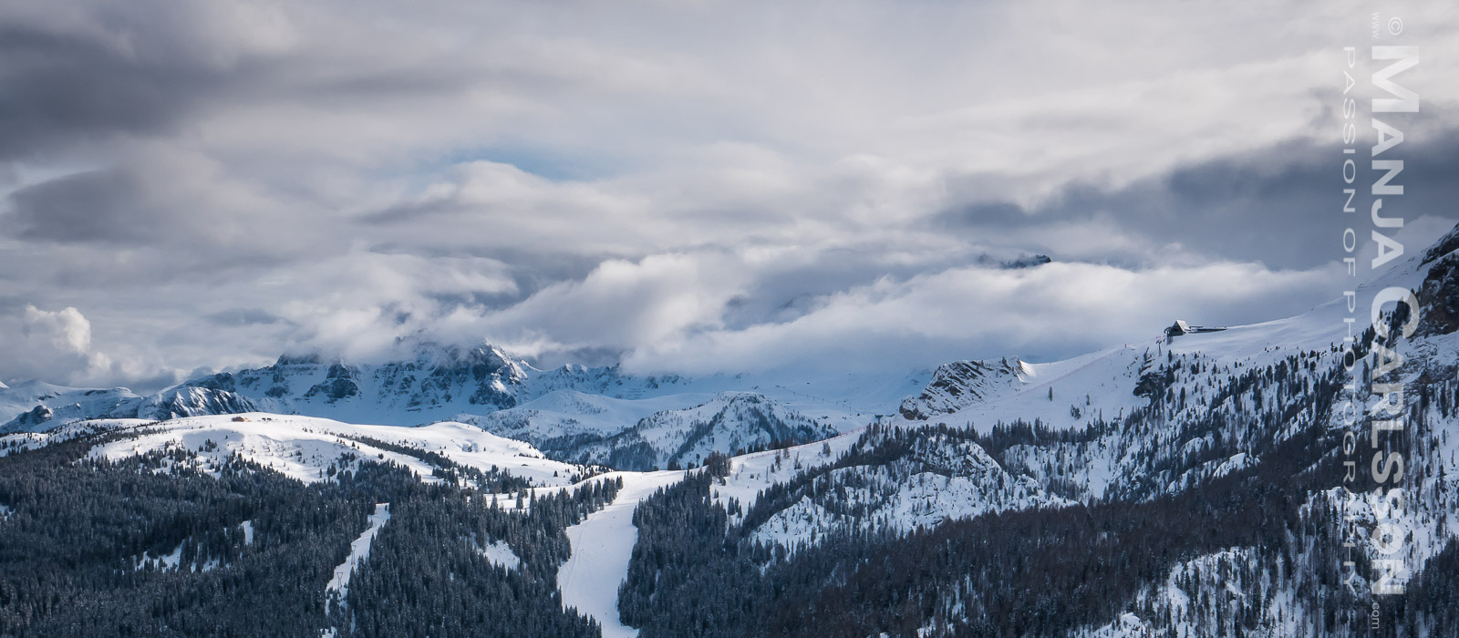 Die Nachmittagssonne stand bereits recht schräg am Himmel. Für einen winzigen Augenblick schien die Sonne den Col Alto nochmal sehr schön seitlich an. Gleich daneben brauten sich die Schneewolken noch stärker zusammen. Auch hier kam erst mit einer Belichtungskorrektur von -1LW die Dramatik erst so richtig gut zur Geltung.