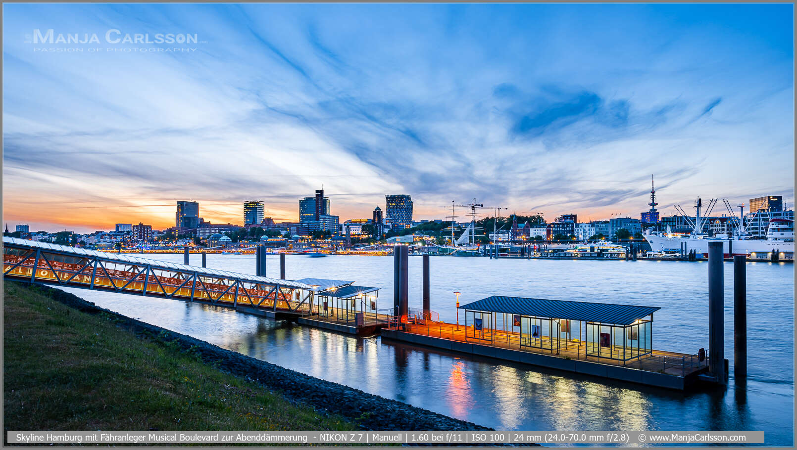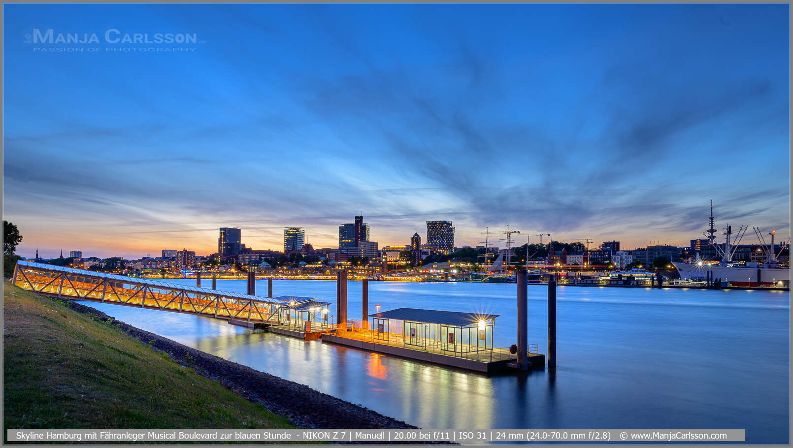 Auch werden jetzt die orangen Lichter vom Fähranleger Musical Boulevard und am Horizont von den Landungsbrücken viel dominanter. Kurzum, diese komplementären Farben orange und blau passen hier sehr schön. Die Abendstimmung mit der Hamburger Skyline ist ein traumhafter Anblick.