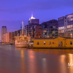 Schnell baute ich mein Stativ* auf und befestigte die Nikon Kamera* mit dem 24-120mm Objektiv* dran. Dann stellte ich fix die Einstellungen für die Nachtfotografie ein, da die Wolken wohl gleich auch noch das letzte abendliche Sonnenlicht im Magdeburger Hafen verschlingen werden.