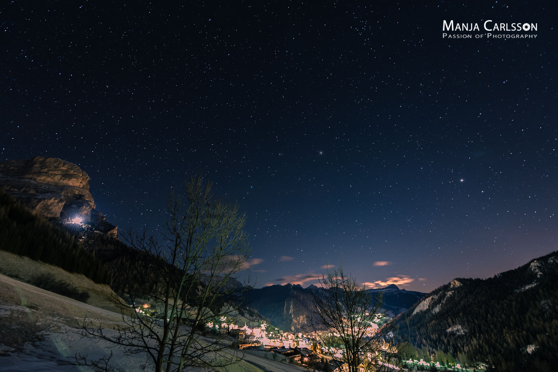 Meine Herausforderung war, das Tal war noch total beleuchtet, obwohl es bereits schon nach Mitternacht war. Dann fuhren auch noch die Pistenraupen um diese Zeit auf den Pisten lang und machten schöne Lichtstreifen auf den Fotos und der Himmel war nachtschwarz mit leichter Blaufärbung am Horizont. Es war irre anzusehen. Diese Kontraste waren zu unterschiedlich. Nein, ich habe immer noch keinen Filter für dieses Objektiv. Aber irgendwie werde ich es hinbekommen. Ich will ja auch nur die Sterne haben.