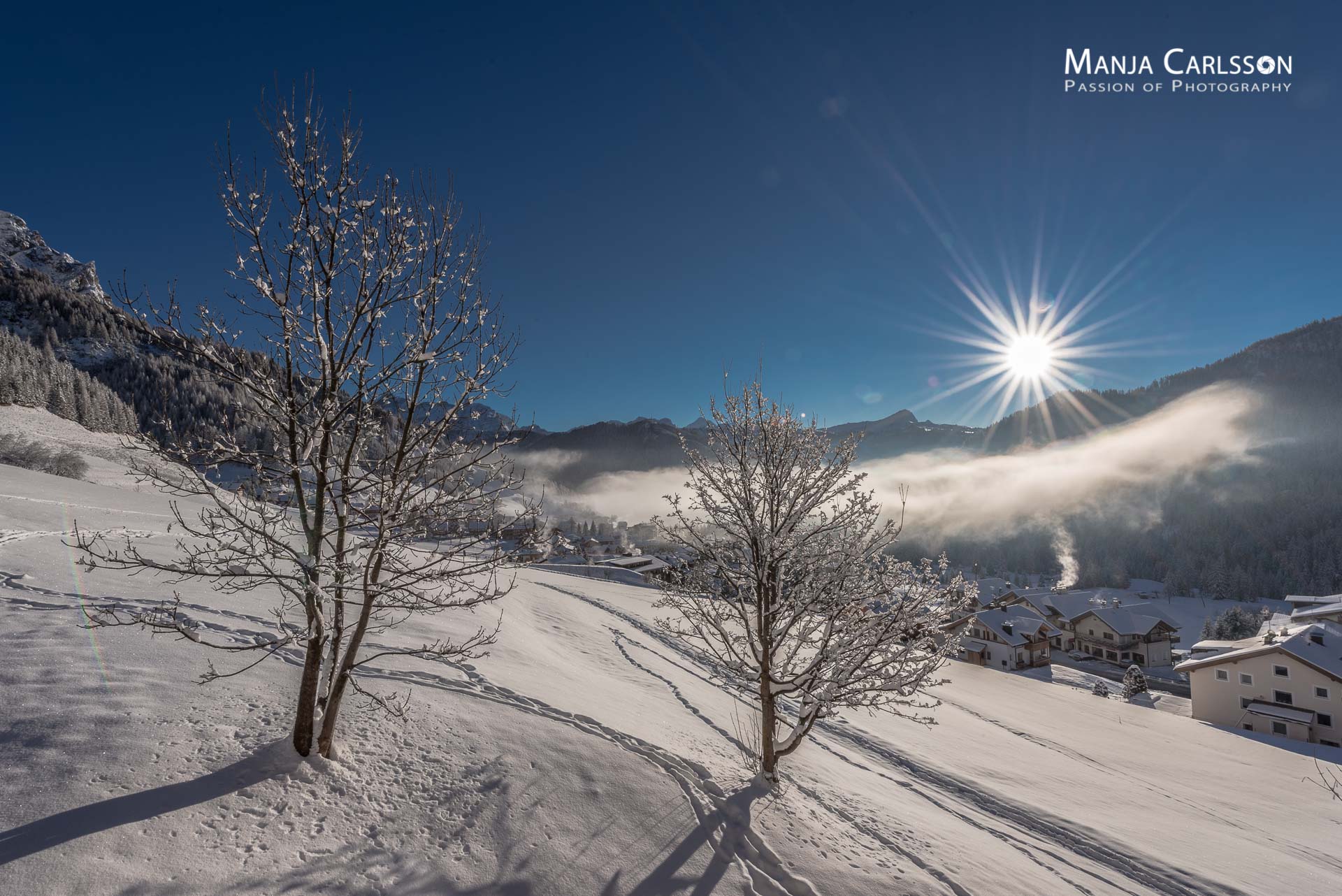 Es war 8.30h, ich wollte doch jetzt schon auf der Piste sein, denn um diese Zeit öffnen die Skilifte. Ich ahnte aber schon, dass dieser Morgen ein besonderer Morgen sein wird und so nahm ich nochmal die Kamera mit Stativ auf den Balkon und holte mir die Sonne mit dem frischen Schnee in den Kasten. Nachteil, wenn man direkt in die Sonne fotografiert, gibt es diese Blendenflecken. Das kann man auch noch irgendwie verhindern mit Mehrfachbelichtungen bzw. Belichtungsreihen. Aber soweit bin ich noch nicht. Dann gingen wir vergnügt auf die Sonnen-Piste. Zwei Tage später gab es wieder einen schönen Sonnenaufgang. Der war allerdings zu kurz und ich verpasste ihn, weil ich da gerade im Bad war. Ärgerlich. Aber alles geht nun auch nicht immer.