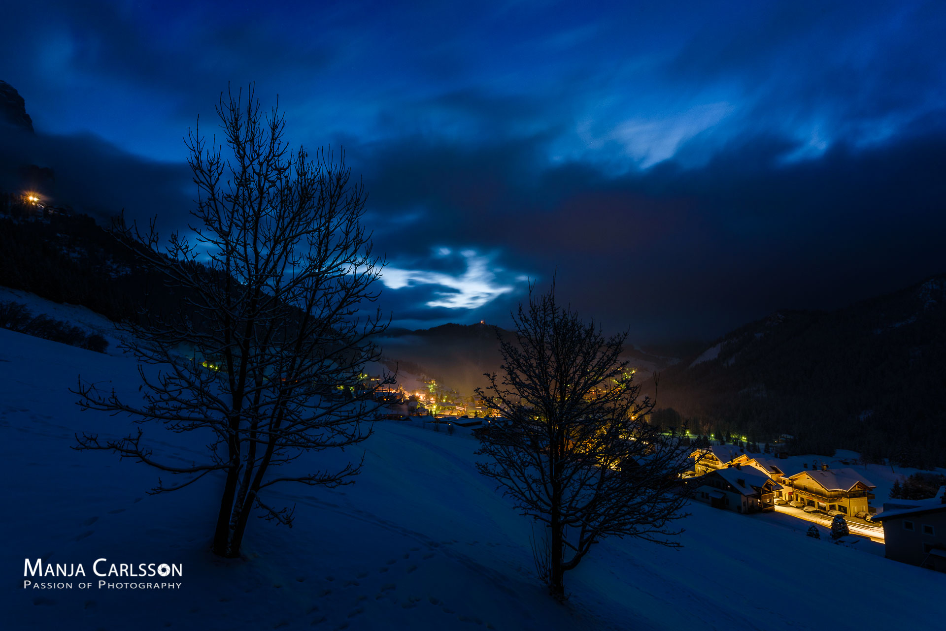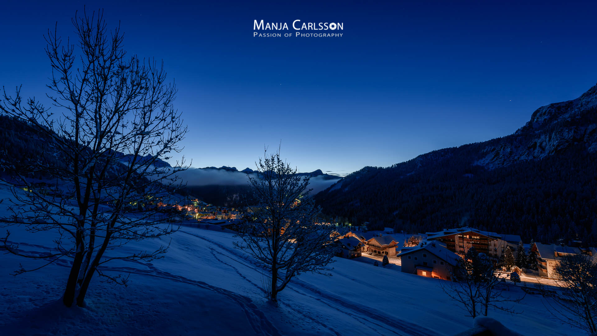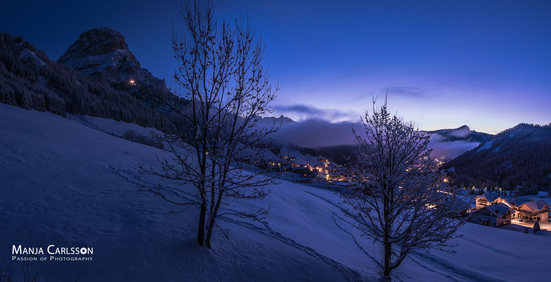Gleich am ersten Abend der Ankunft, das Auto war gerade ausgeladen und der Kleiderschrank gefüllt, hatte ich diesen tollen Blick. Kamera und Stativ waren zum Glück schon ausgepackt und warteten auf ihren ersten Einsatz in den Dolomiten. Wieder einmal warf ich einen Blick ins Tal aus dem Fenster und mir blieb der Mund offen stehen. Seit mehr als 3 Stunden war es am Schneien und die Wolken hingen tief im Tal fest. Die blaue Stunde, also die Dämmerungsphase, war voll im Gange und das Licht was sich da gerade bot, war der Wahnsinn.
