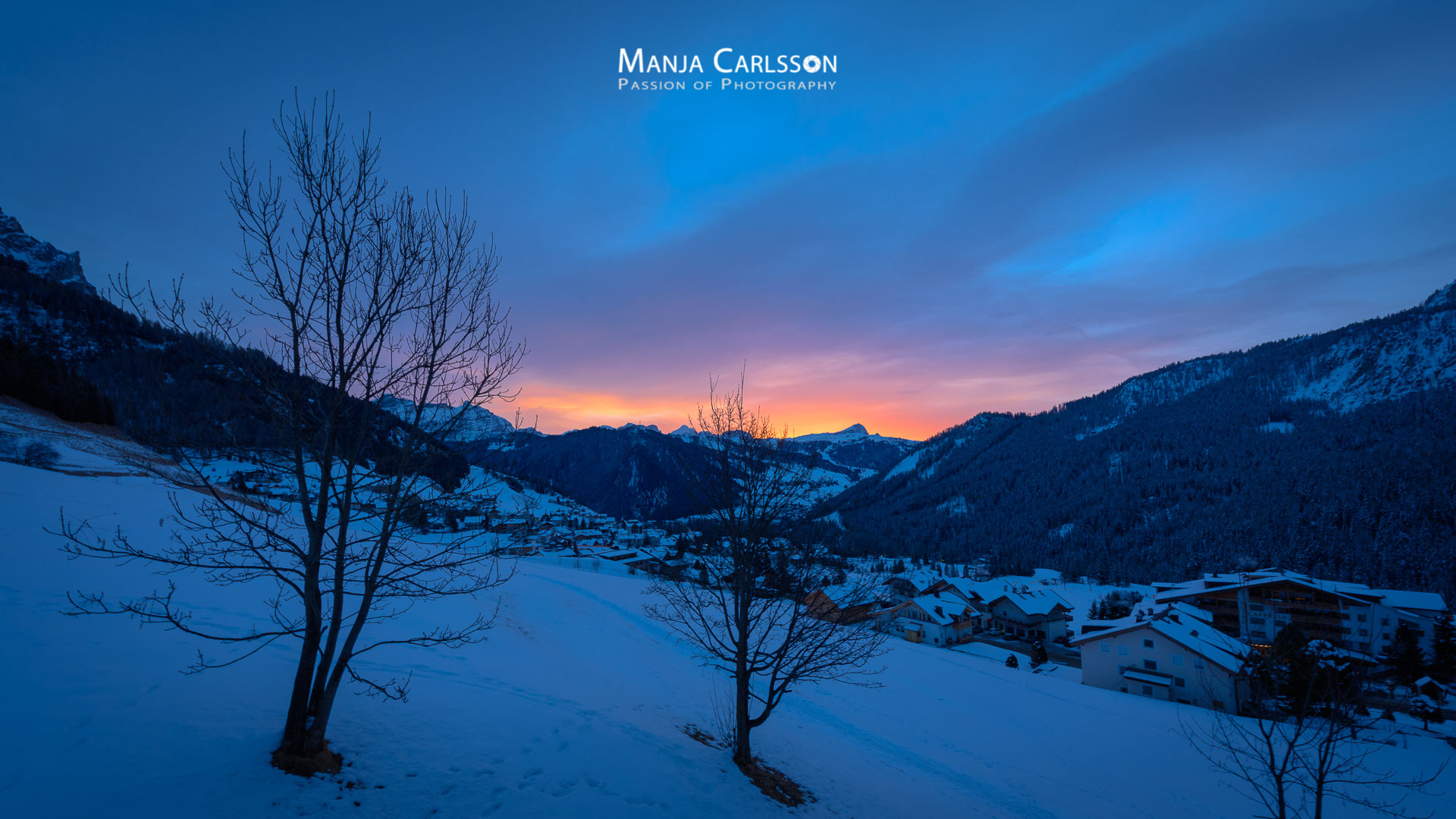 Es war noch früh in der Morgendämmerung zur blauen Stunde. Am Horizont meldete sich schon langsam das Morgenlicht an. Der Wolkenstreifen zog von Arraba durch das Corvara-Tal durch und die ersten Autos waren schon auf der Straße. Die letzten Sterne waren noch hoch oben am Himmel zu sehen. Ich sah einfach nur verträumt ins Tal und beobachtete sein Erwachen. Zwischendurch machte ich das eine oder andere Foto.